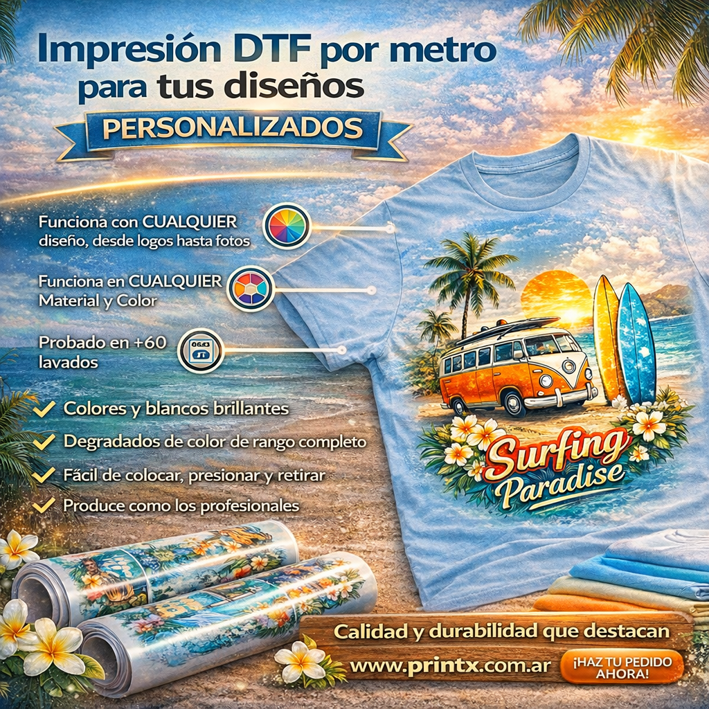 En un mercado que exige precisión, nuestro Transfer DTF por metros destaca como la opción más confiable. Nos adaptamos a las necesidades de la industria de la moda y el sector promocional, ofreciendo una solución de impresión de gran formato que combina durabilidad con un acabado impecable. Confía en nuestra tecnología para dar vida a tus ideas.