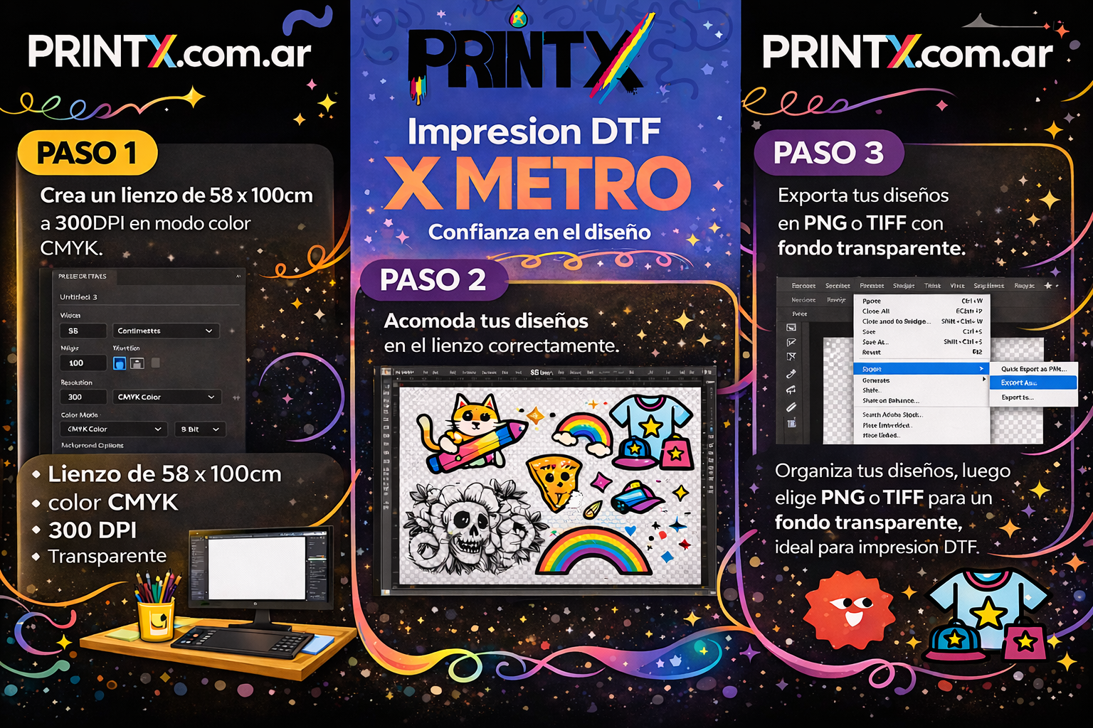 2.Enviá tu archivo en formato PNG, TIF o PDF siempre en Fondo Transparente y Tamaño en escala real con definicion 300Dpi